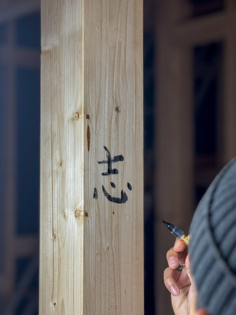 ※棟上げで柱に、お家やご家族のテーマの漢字一文字を施主様に書いていただくセレモニーを