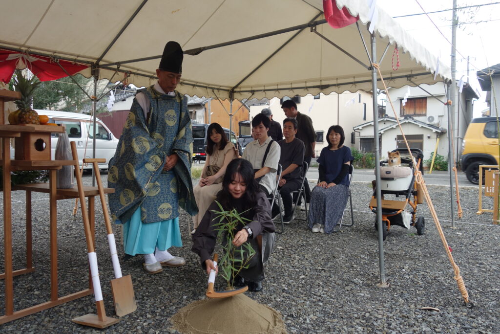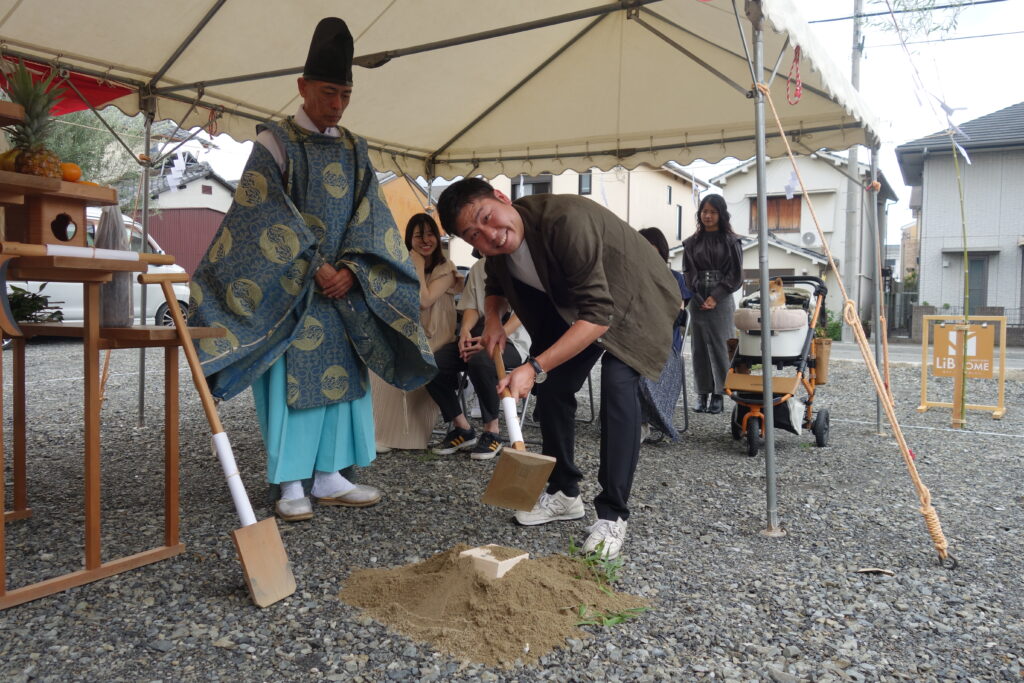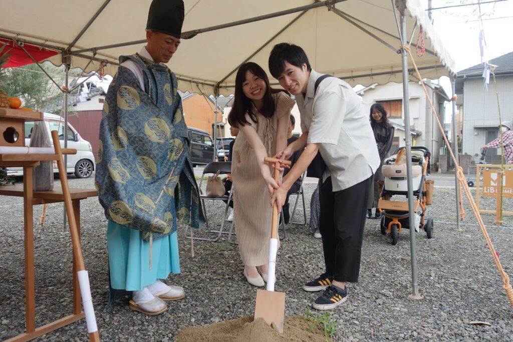 谷本が工事の安全とIさまご家族の幸せを願って、力強く「鍬入れの儀(くわいれのぎ)」を行いました。
