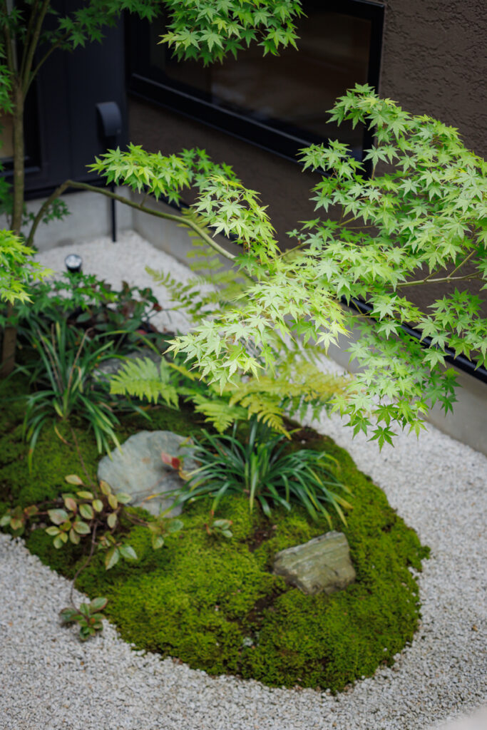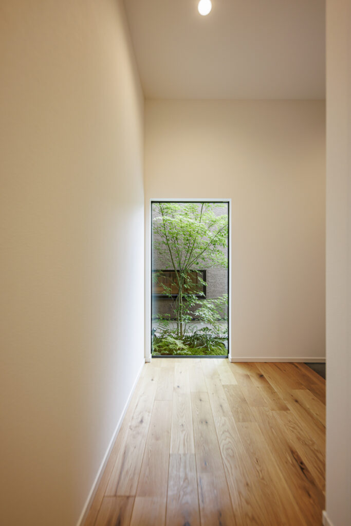家の中央に坪庭を配置。玄関・和室リビングからつながる景観。