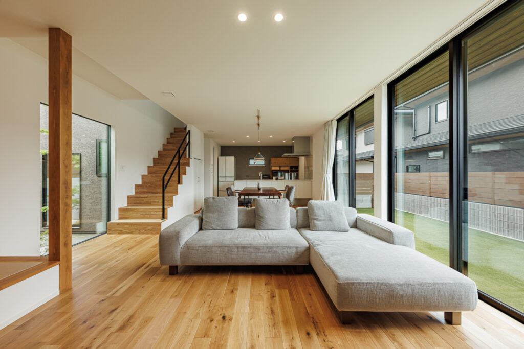 大きく開放した南側の窓。庇で夏の直射日光もしっかりガード。