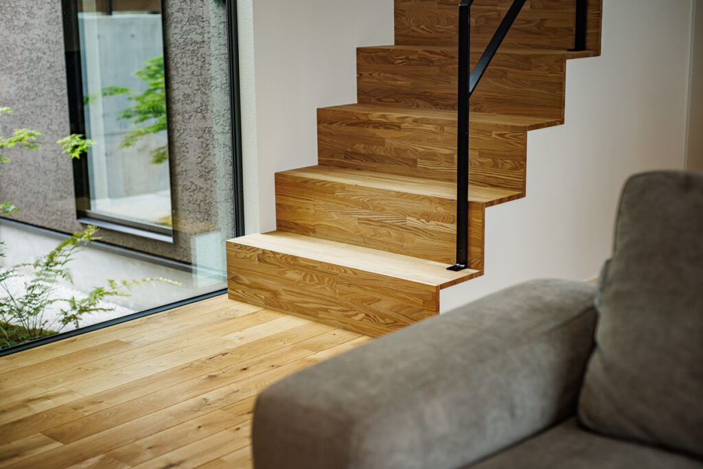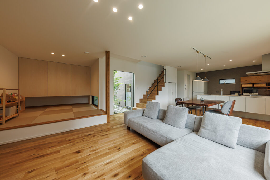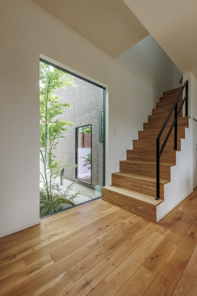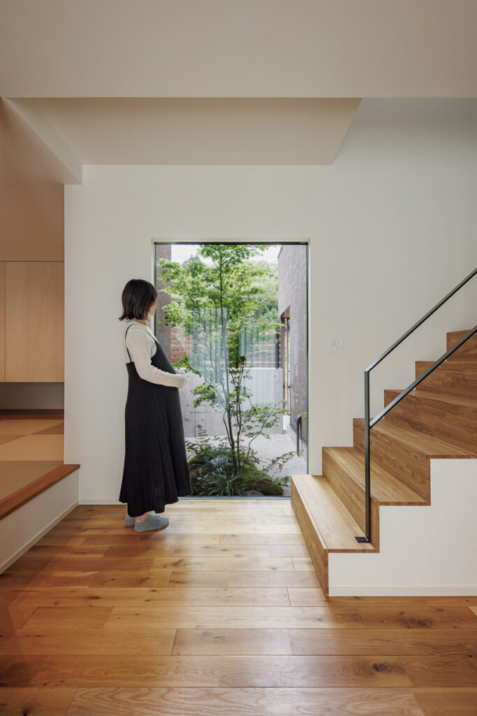 家の中央に坪庭を配置し、玄関・和室リビングから繋がるように設計。