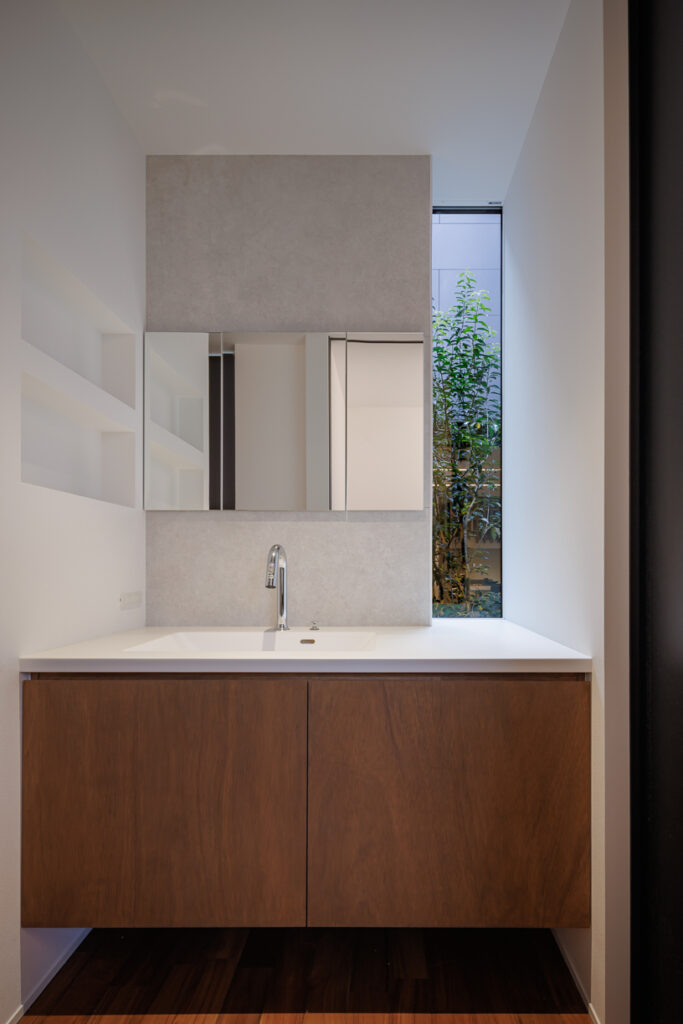 造作の洗面台。こちらからも中庭が望めるようFIX窓を設けています。