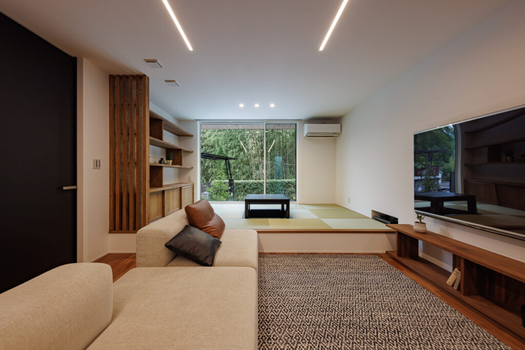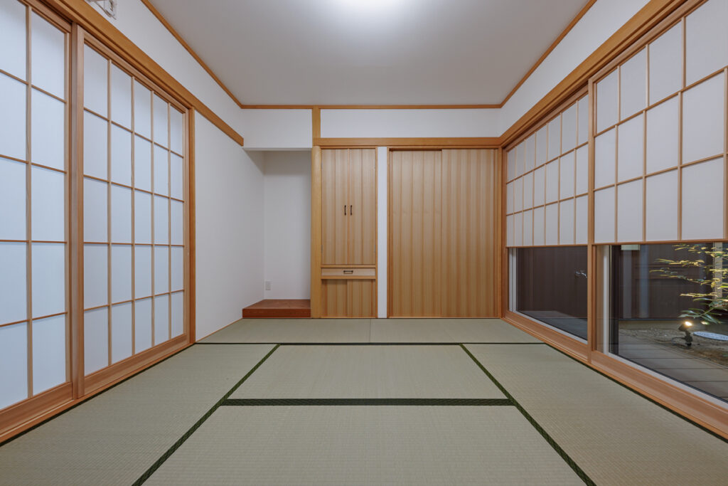 和室に雪見障子を設けることで、中庭の景色を一年中楽しめます。