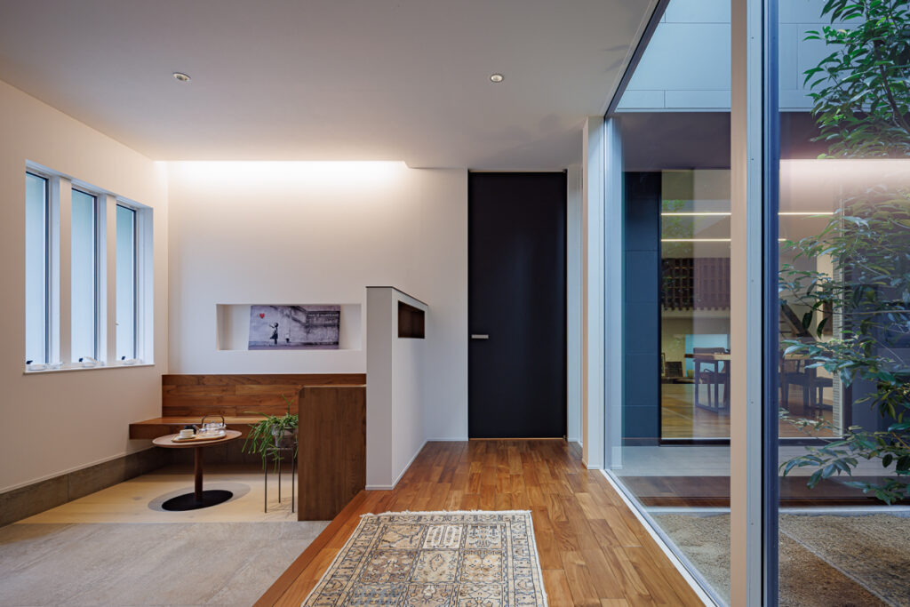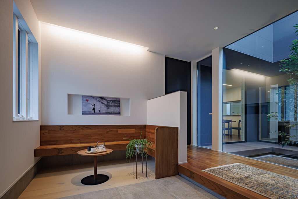 広い玄関には、中庭が見渡せる腰掛け応接ベンチ。
