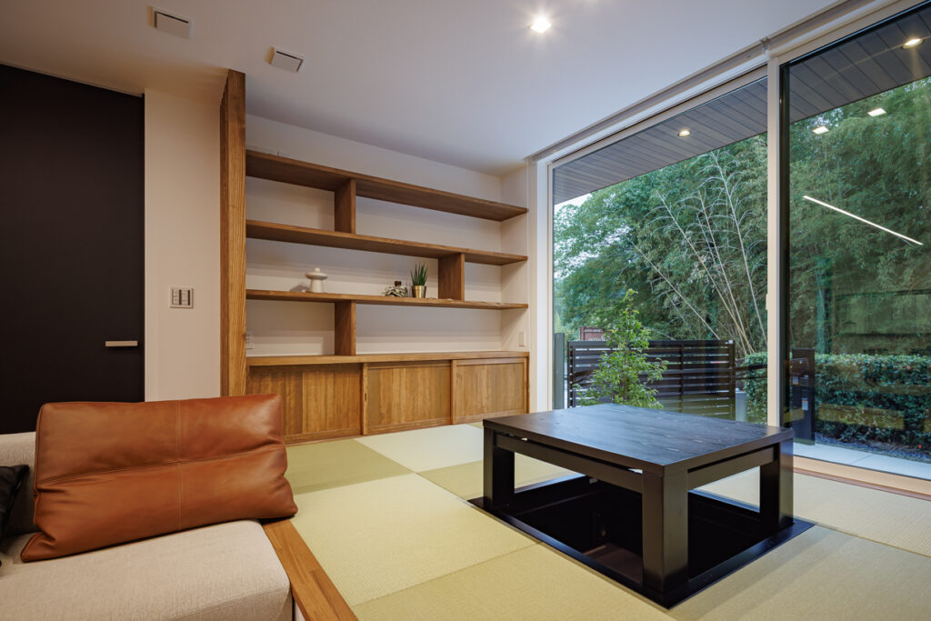 小上がりの畳コーナーには掘りごたつと造作の棚を設けました。