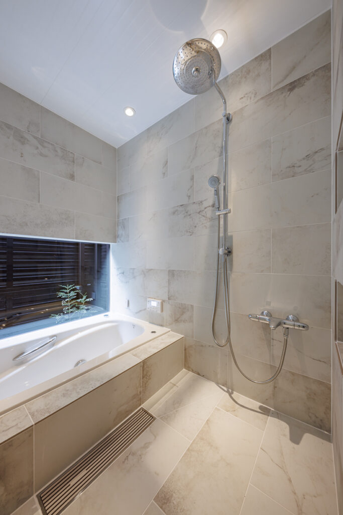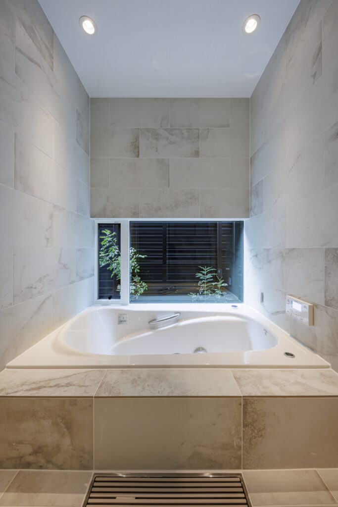お風呂はこだわりの造作。浴槽から植栽が眺められるよう壁いっぱいを窓にしました。