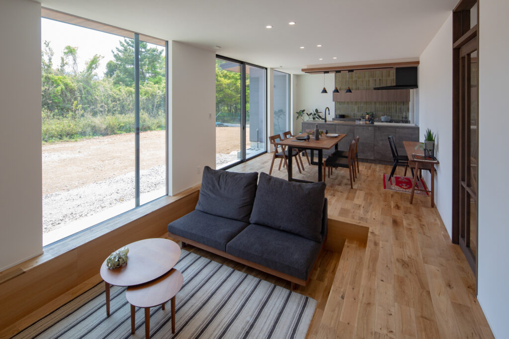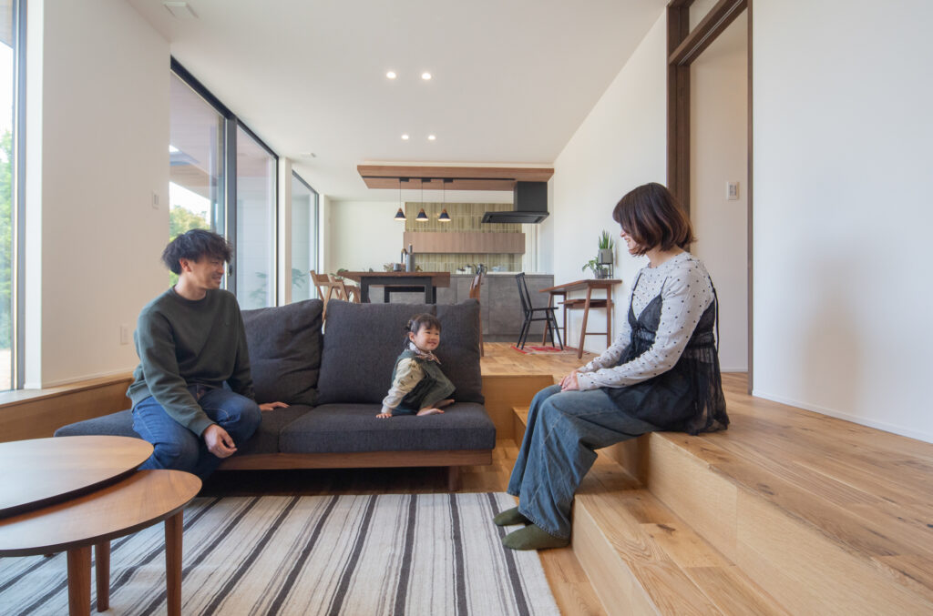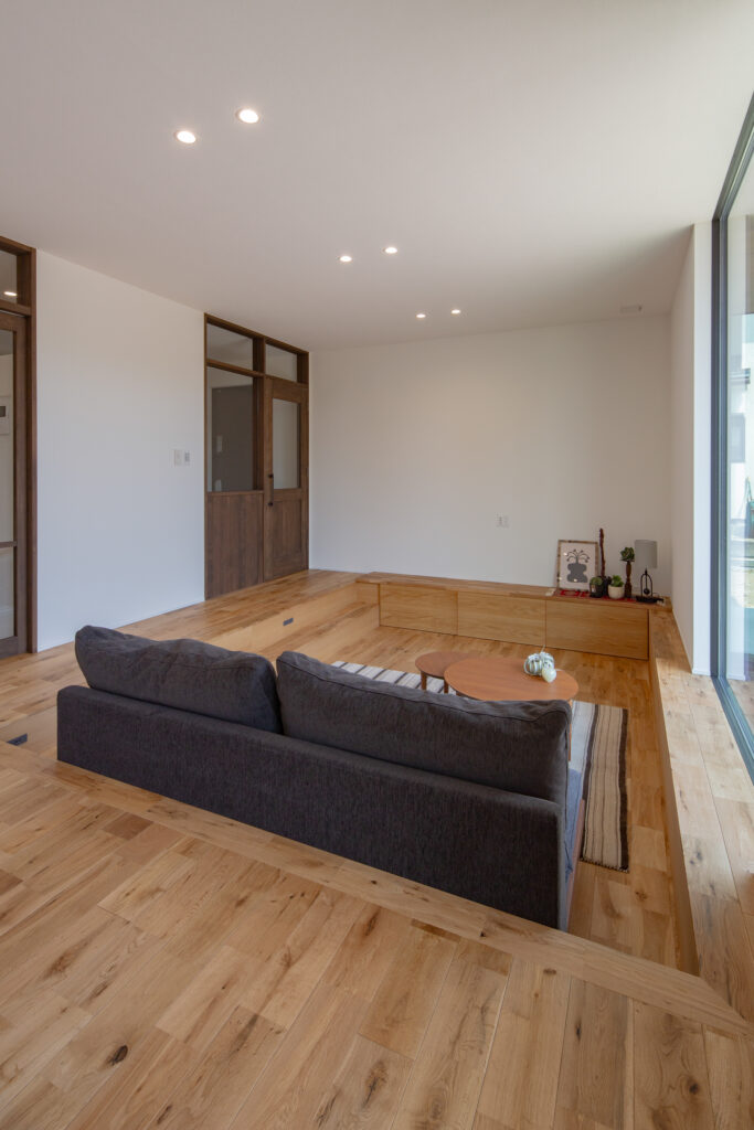 一段おりて目線が下がることで空間が広がり家族がゆったり過ごせるピットリビング。