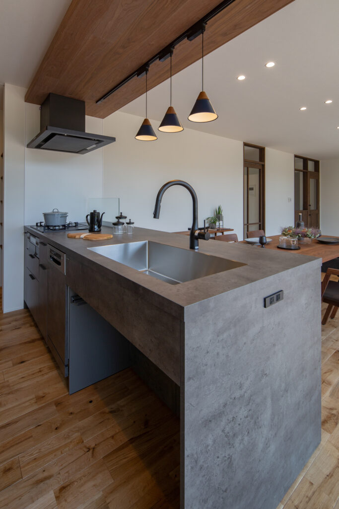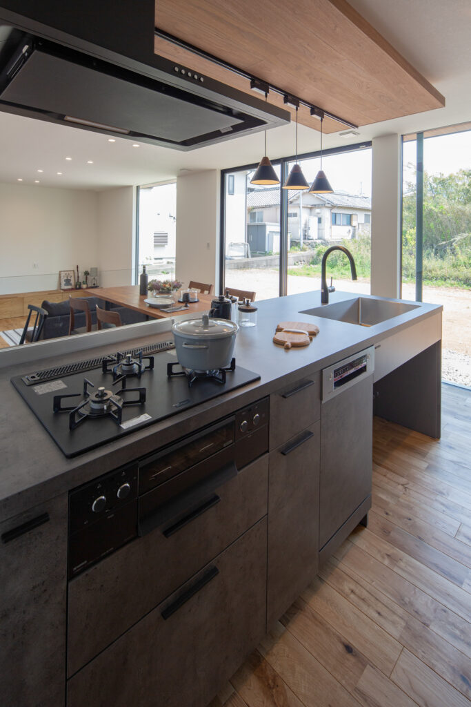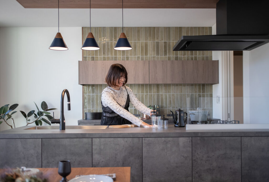グラフテクトキッチンとタイルの壁でキッチンで過ごす時間も有意義に。