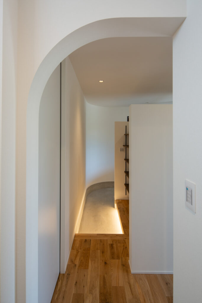 やわらかな曲線が印象的なアールの壁の玄関エリア。
